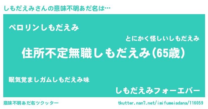 | 男性向けラノベタイトル風あだ名 | 『この素晴らしい世界にしもだえみを!』 |