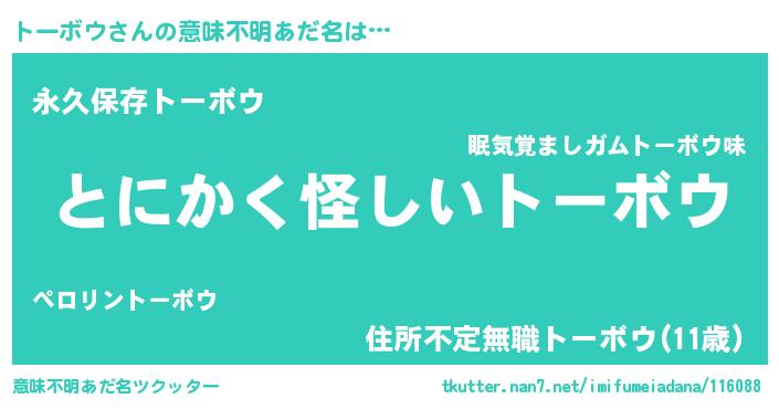 | 欧米人風あだ名 | 『ウサイントーボウ』『ダニエルトーボウ』 |