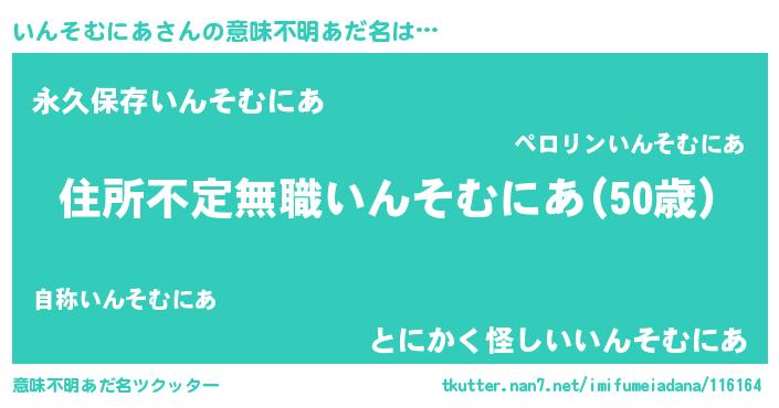 | 男性向けラノベタイトル風あだ名 | 『この素晴らしい世界にいんそむにあを!』 |