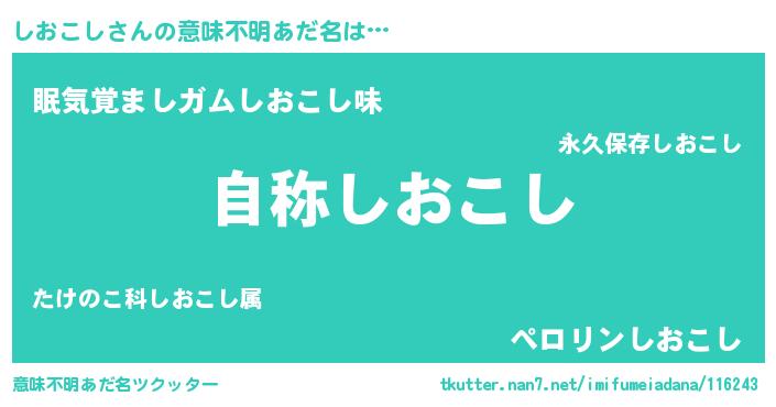 | 男性向けラノベタイトル風あだ名 | 『Re:しおこしから始める異世界生活』 |