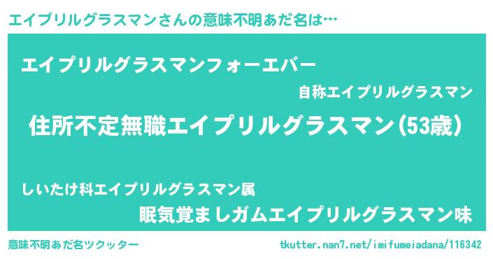 | 男性向けラノベタイトル風あだ名 | 『この素晴らしい世界にエイプリルグラスマンを!』 |