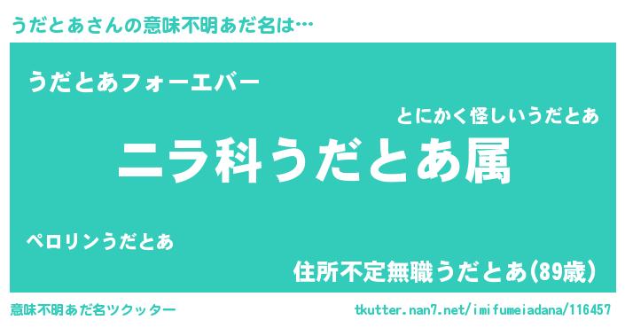 | 男性向けラノベタイトル風あだ名 | 『うだとあ~年齢イコール彼女いない歴の魔法使い~』 |
