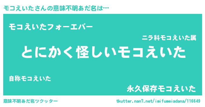 | 男性向けラノベタイトル風あだ名 | 『モコえいたに滅ぼされるだけの簡単なお仕事です』 |