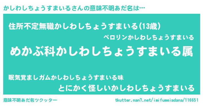 | 欧米人風あだ名 | 『トリンドルかしわしちょうすまいる』 |