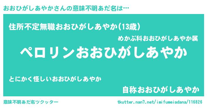 | 女子向けラノベタイトル風あだ名 | 『(仮)おおひがしあやかのやんごとなき事情』 |