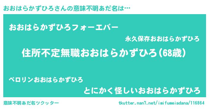 | 男性向けラノベタイトル風あだ名 | 『魔弾の王とおおはらかずひろ』 |