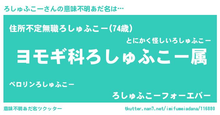 | 男性向けラノベタイトル風あだ名 | 『ろしゅふこー~年齢イコール彼女いない歴の魔法使い~』 |