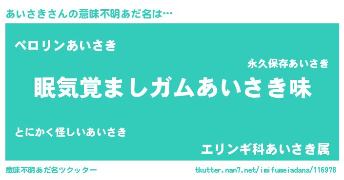 | ヒーロー風カッコイイあだ名 | 『正義の使者あいさき』『ネオアイサキ』 |