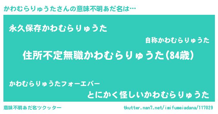 | 女子向けラノベタイトル風あだ名 | 『悪役かわむらりゅうたに転生したようですが、知った事ではありません』 |