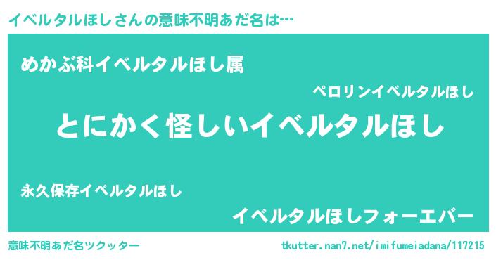 | ポケモン風あだ名 | 『ヒイベルタルホシ』『イベゴンZ』 |