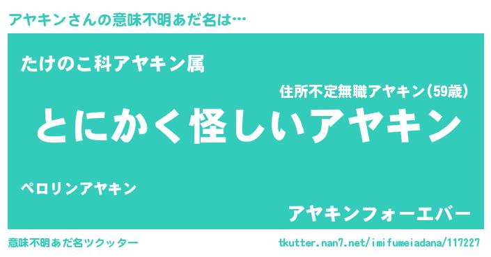 | 女子向けラノベタイトル風あだ名 | 『アヤキン様がみてる』 |