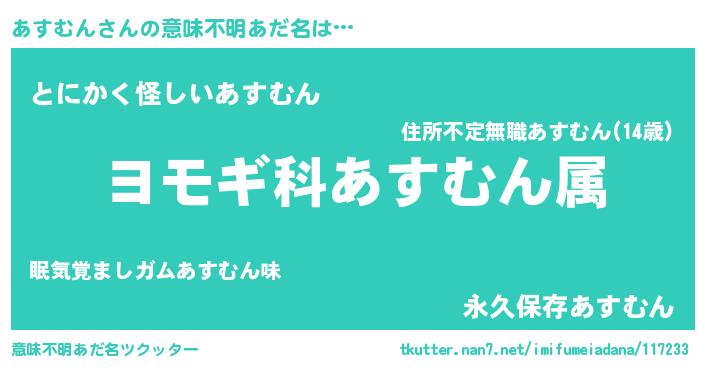 | 男性向けラノベタイトル風あだ名 | 『あすむん~年齢イコール彼女いない歴の魔法使い~』 |