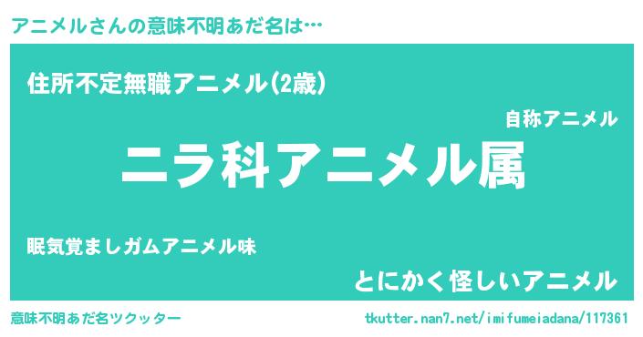 | 男性向けラノベタイトル風あだ名 | 『うちのアニメルが世界を掌握している!』 |