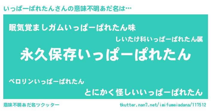 | 男性向けラノベタイトル風あだ名 | 『いっぱーぱれたんという概念が存在しない退屈な世界 』 |