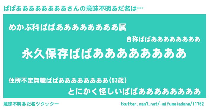 | 男性向けラノベタイトル風あだ名 | 『ばばああああああああという概念が存在しない退屈な世界 』 |