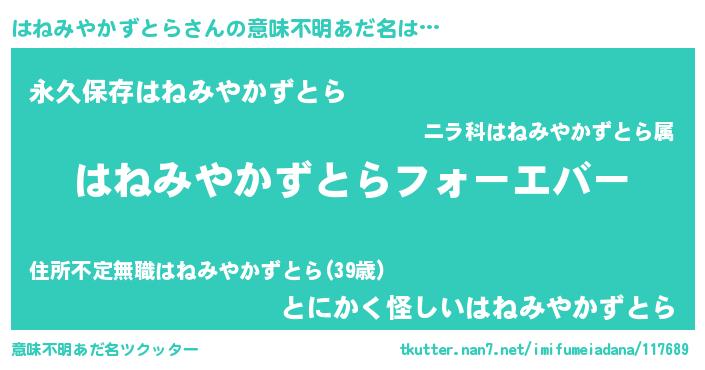 | 女子向けラノベタイトル風あだ名 | 『はねみやかずとらの雑貨屋さん』 |