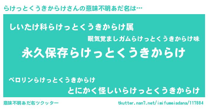| 女子向けラノベタイトル風あだ名 | 『異世界でカフェらけっとくうきからけを開店しました。』 |