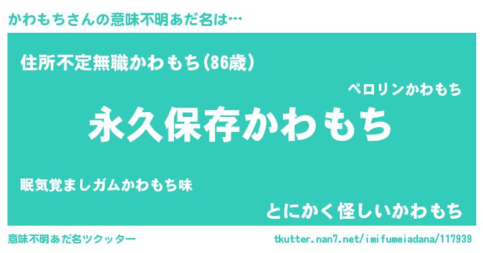 | 男性向けラノベタイトル風あだ名 | 『かわもちという概念が存在しない退屈な世界 』 |
