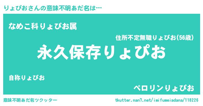 | 男性向けラノベタイトル風あだ名 | 『りょぴおという概念が存在しない退屈な世界 』 |