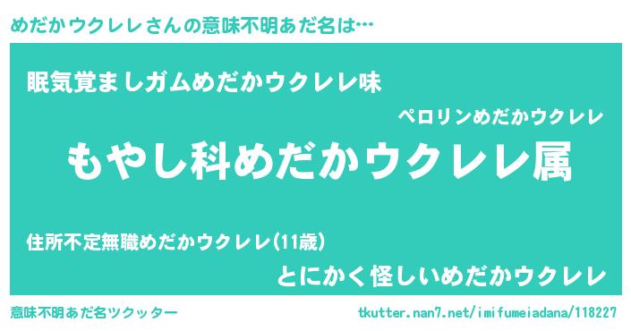 | 男性向けラノベタイトル風あだ名 | 『転生したらめだかウクレレだった件』 |