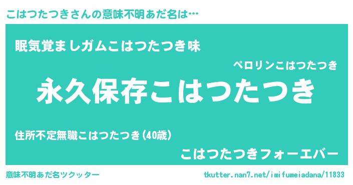 | 男性向けラノベタイトル風あだ名 | 『こはつたつきに滅ぼされるだけの簡単なお仕事です』 |