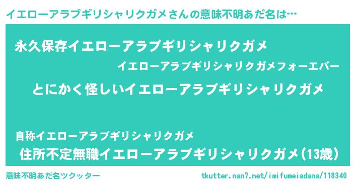 | 男性向けラノベタイトル風あだ名 | 『イエローアラブギリシャリクガメの嫁は女の子じゃないと思った?』 |