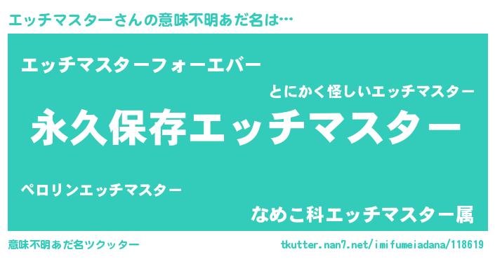 | 男性向けラノベタイトル風あだ名 | 『エッチマスターという概念が存在しない退屈な世界 』 |
