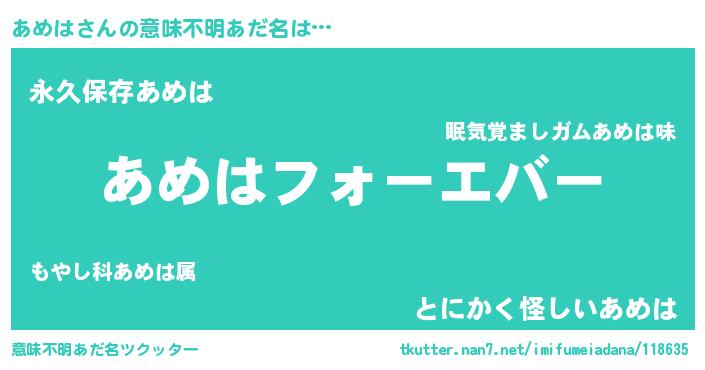 | 男性向けラノベタイトル風あだ名 | 『あめはに滅ぼされるだけの簡単なお仕事です』 |