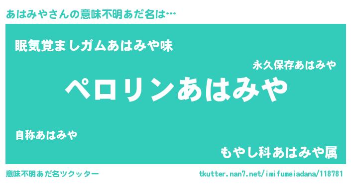 | 女子向けラノベタイトル風あだ名 | 『(仮)あはみやのやんごとなき事情』 |
