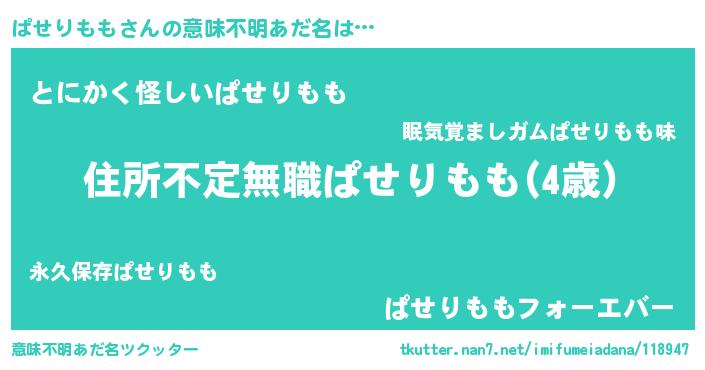 | 男性向けラノベタイトル風あだ名 | 『この素晴らしい世界にぱせりももを!』 |