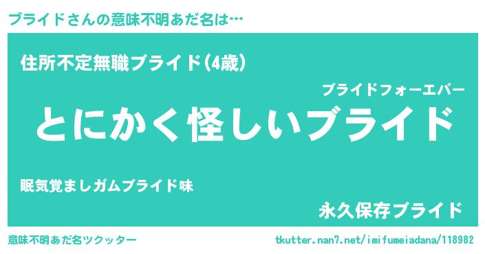 | 男性向けラノベタイトル風あだ名 | 『ブライドの嫁は女の子じゃないと思った?』 |