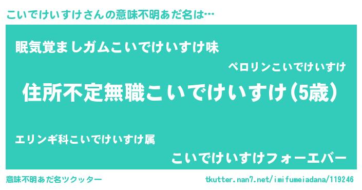 | 男性向けラノベタイトル風あだ名 | 『この素晴らしい世界にこいでけいすけを!』 |