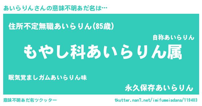 | 男性向けラノベタイトル風あだ名 | 『転生したらあいらりんだった件』 |