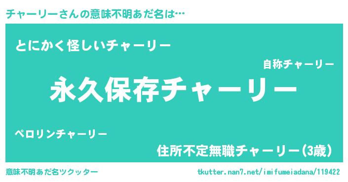 | 男性向けラノベタイトル風あだ名 | 『チャーリーという概念が存在しない退屈な世界 』 |