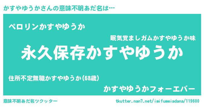 | 男性向けラノベタイトル風あだ名 | 『かすやゆうかという概念が存在しない退屈な世界 』 |