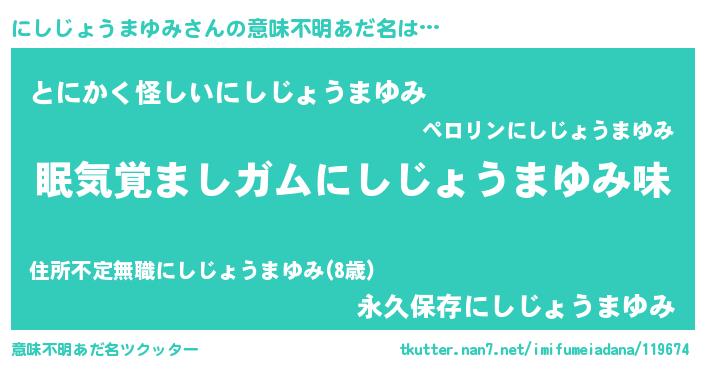 | 男性向けラノベタイトル風あだ名 | 『おまえをオタクにしてやるから、俺をにしじょうまゆみにしてくれ! 』 |