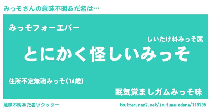 | ヒーロー風カッコイイあだ名 | 『黄金騎士ミッ』『ウルトラみっそマン』 |