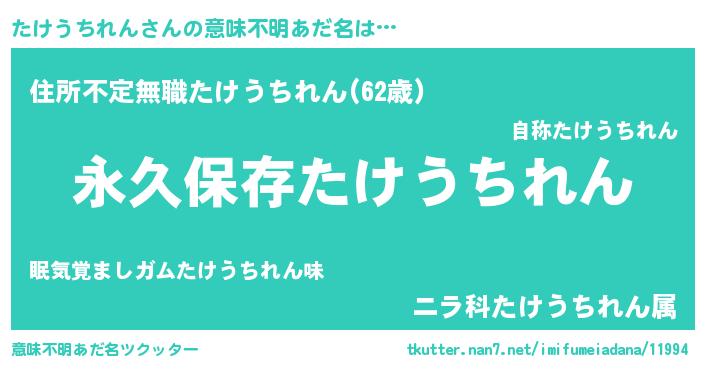 | ヘコむあだ名 | 『たけうちれん(遠い目)』『たけにゅー』 |