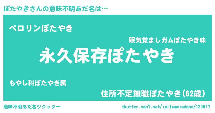 | 胡散臭い通販商品みたいなあだ名 | 『絶対に幸福をもたらす健康食品…その名も「ぽたやき」』 |