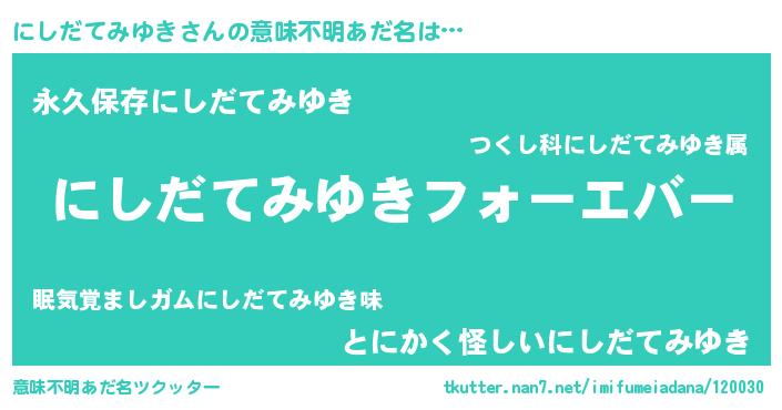 | 女子向けラノベタイトル風あだ名 | 『にしだてみゆきの雑貨屋さん』 |