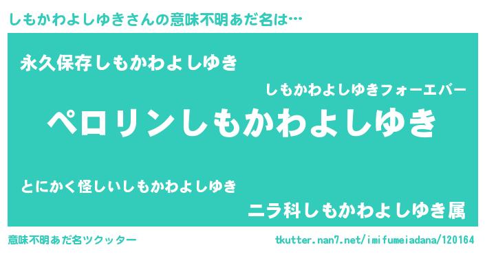 | 胡散臭い通販商品みたいなあだ名 | 『億万長者になれるブレスレット…その名も「しもかわよしゆき」』 |