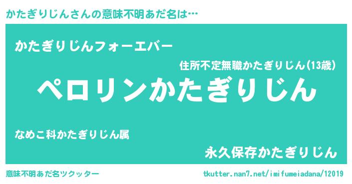 | 男性向けラノベタイトル風あだ名 | 『うちのかたぎりじんが世界を掌握している!』 |