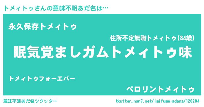 | ヒーロー風カッコイイあだ名 | 『慈愛の使者トメィトゥ』『仮面トメダー』 |