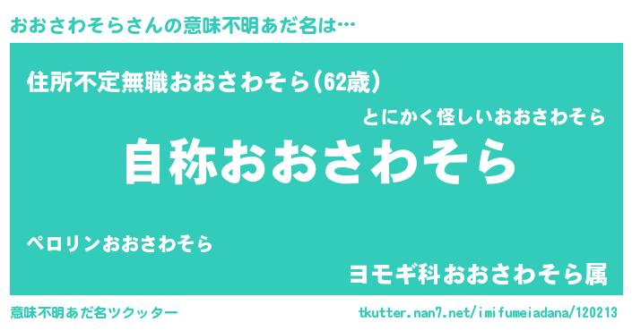 | 男性向けラノベタイトル風あだ名 | 『Re:おおさわそらから始める異世界生活』 |