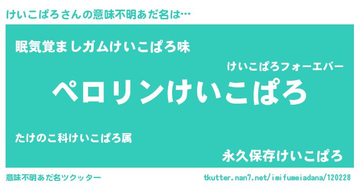 | 男性向けラノベタイトル風あだ名 | 『うちのけいこぱろが世界を掌握している!』 |