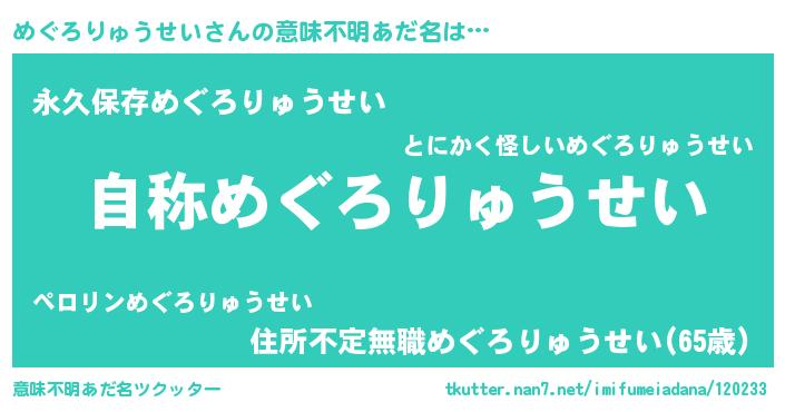 | ヘコむあだ名 | 『めぐろりゅうせい(震え声)』『めぐ太郎』 |
