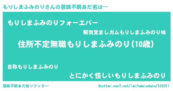 | 女子向けラノベタイトル風あだ名 | 『乙女ゲームの破滅フラグしかない悪役もりしまふみのりに転生してしまった…』 |