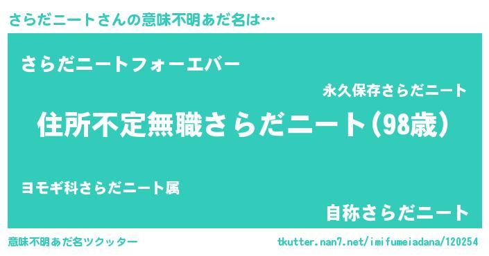 | 女子向けラノベタイトル風あだ名 | 『さらだニートが死なない童話 林檎のさらだニートの診療簿』 |