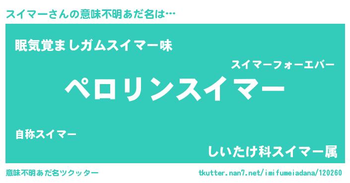 | 男性向けラノベタイトル風あだ名 | 『スイマーの憂鬱』『スイマースレイヤー』 |