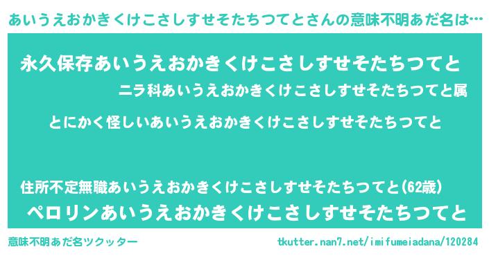 | 女子向けラノベタイトル風あだ名 | 『あいうえおかきくけこさしすせそたちつてと様がみてる』 |